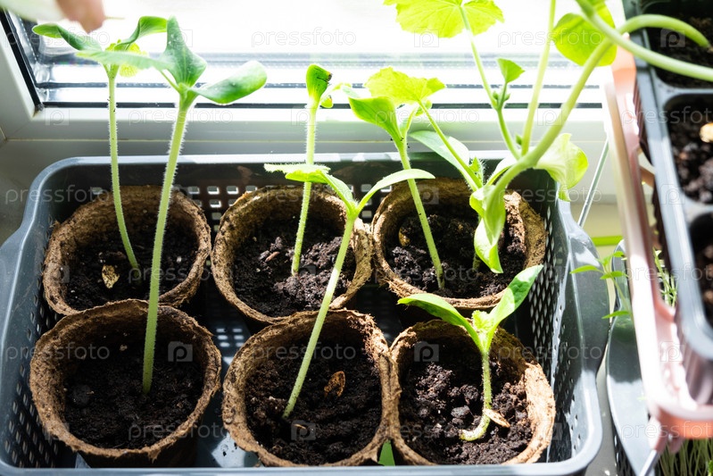 Рассада огурцов и кабачков в торфяных стаканчиках для посадки на грядку весной на подоконник