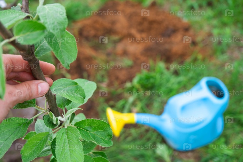 Саженец яблони в саду подготовлен к посадке в открытый грунт. Плодовое дерево из питомника, выращивание органических фруктов на своем участке