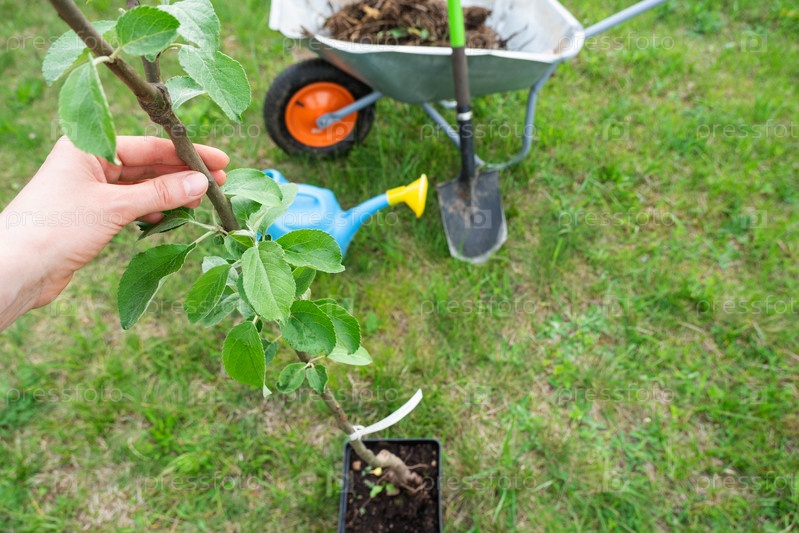 Саженец яблони в саду подготовлен к посадке в открытый грунт. Плодовое дерево из питомника, выращивание органических фруктов на своем участке