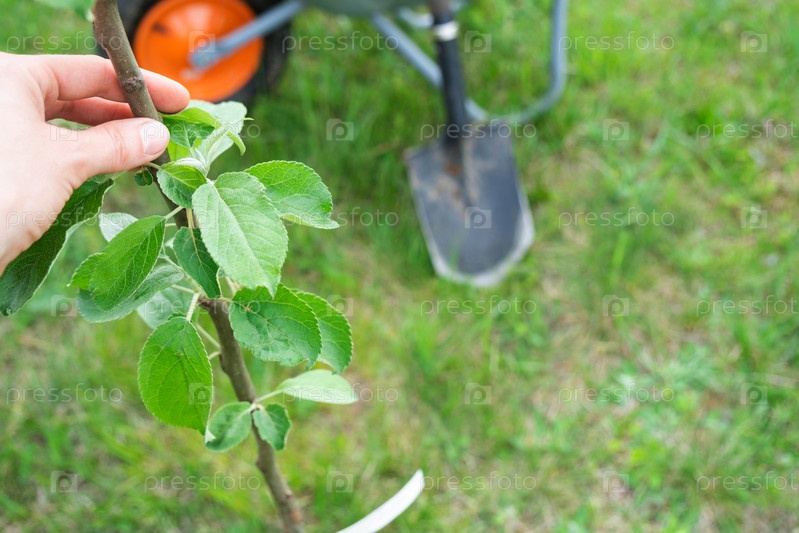 Саженец яблони в саду подготовлен к посадке в открытый грунт. Плодовое дерево из питомника, выращивание органических фруктов на своем участке