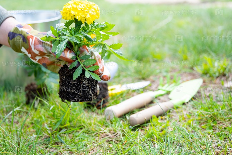 Саженцы желтых и оранжевых бархатцев с корнями готовятся к высадке в открытый грунт весной. Неприхотливые садовые цветы в руках садовода, клумба и уход за двором