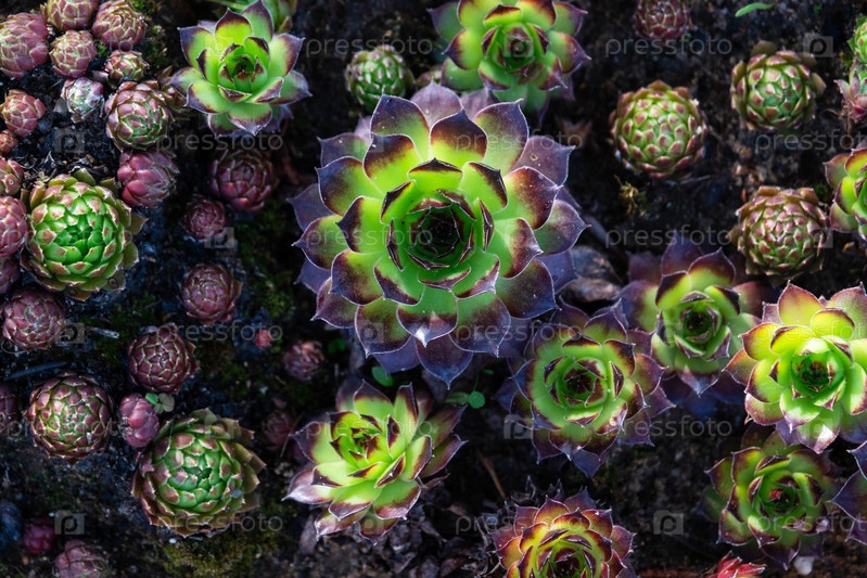 Естественный фон суккулентов для газона, уличных растений. Узор из зеленых цветов эониума, хавортии