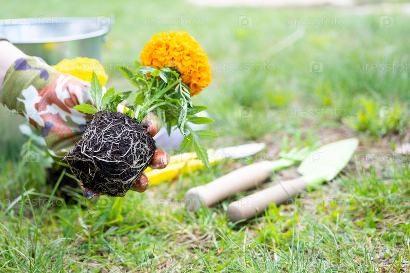 Саженцы желтых и оранжевых бархатцев с корнями готовятся к высадке в открытый грунт весной. Неприхотливые садовые цветы в руках садовода, клумба и уход за двором