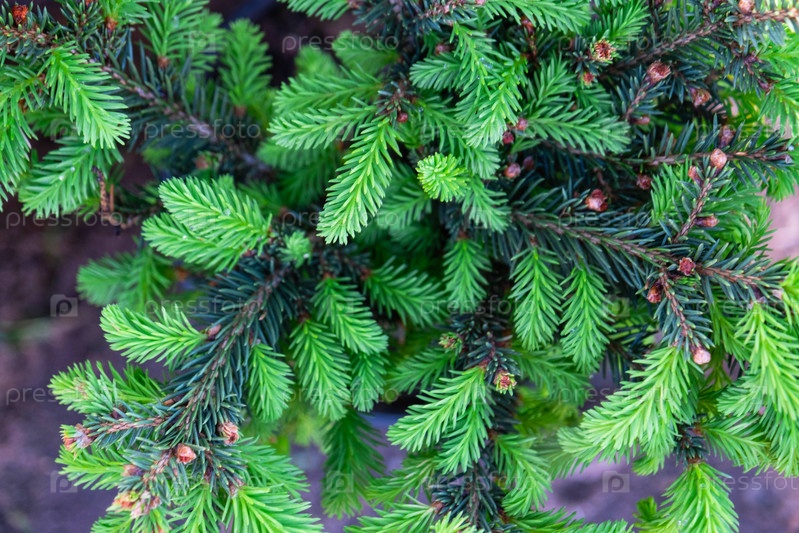 Молодые побеги со свежими ярко-зелеными иглами на еловых ветвях