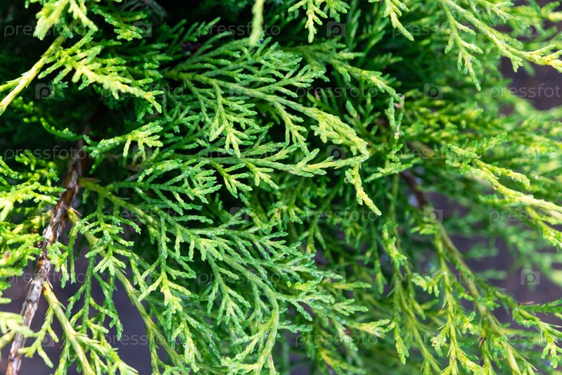 Молодые побеги со свежей ярко-зеленой хвоей на ветвях можжевельника, туи. Узор, зеленый естественный фон