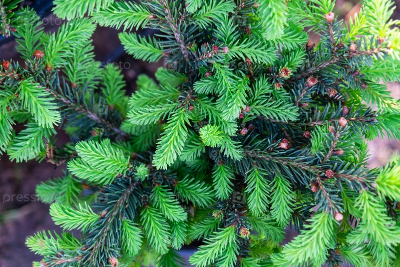 Молодые побеги со свежими ярко-зелеными иглами на еловых ветвях