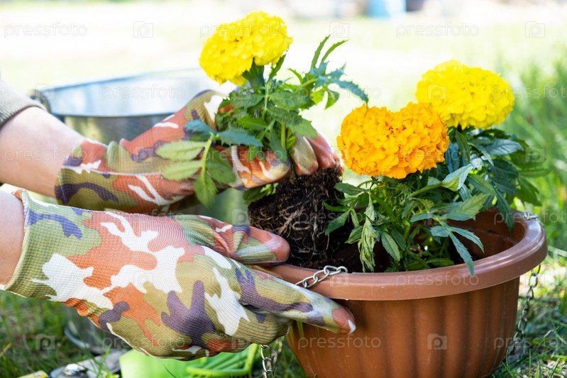 Саженцы желтых и оранжевых бархатцев с корнями готовятся к высадке в открытый грунт весной. Неприхотливые садовые цветы в руках садовода, клумба и уход за двором