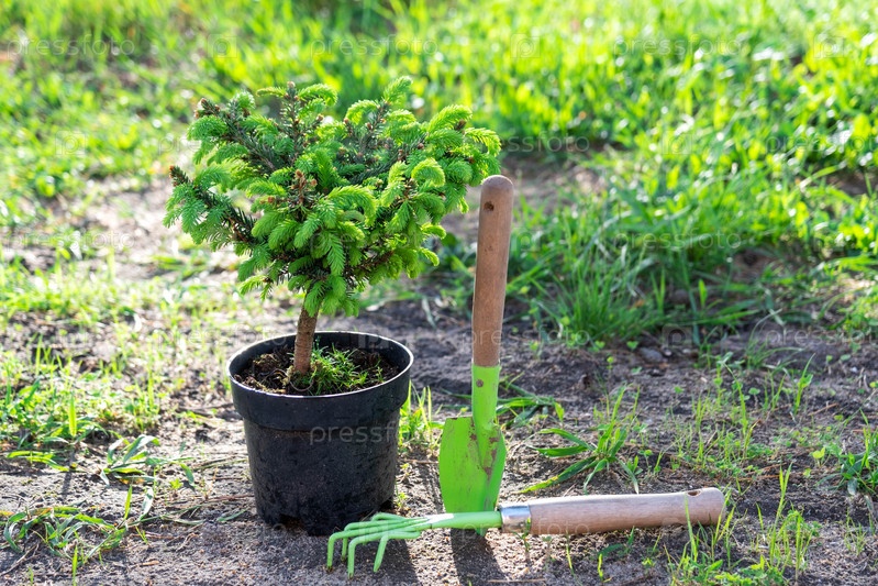 Хвойные растения в горшках с закрытым корнем для посадки на своем приусадебном участке из питомника. Озеленение садового участка весной