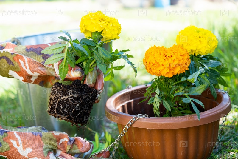 Саженцы желтых и оранжевых бархатцев с корнями готовятся к высадке в открытый грунт весной. Неприхотливые садовые цветы в руках садовода, клумба и уход за двором