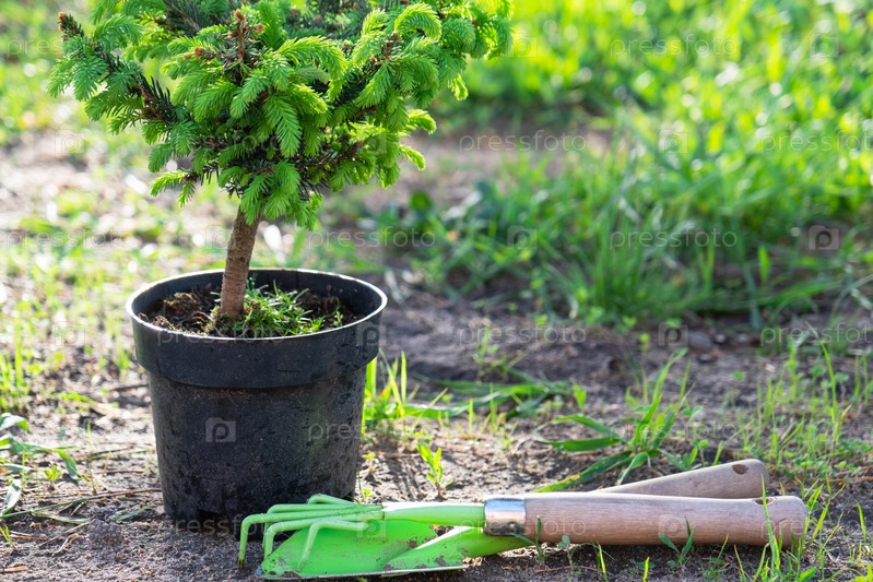 Хвойные растения в горшках с закрытым корнем для посадки на своем приусадебном участке из питомника. Озеленение садового участка весной