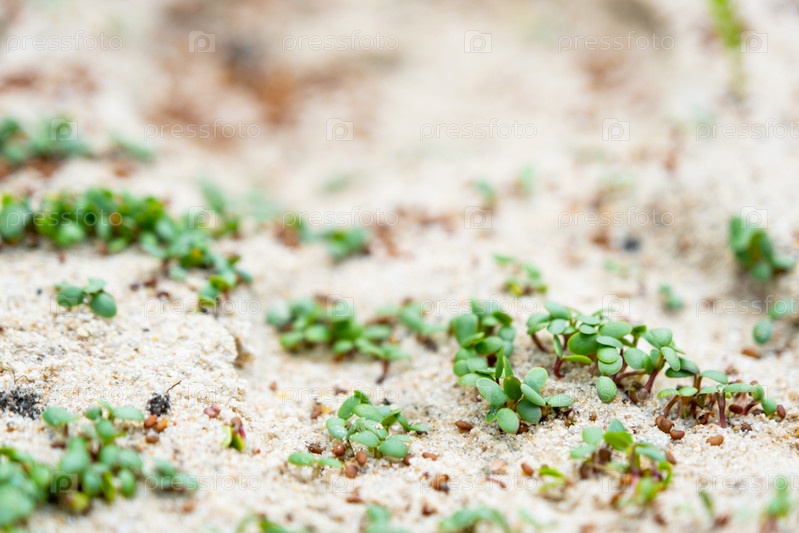 Проросшие семена газона крупным планом на песке - клевер