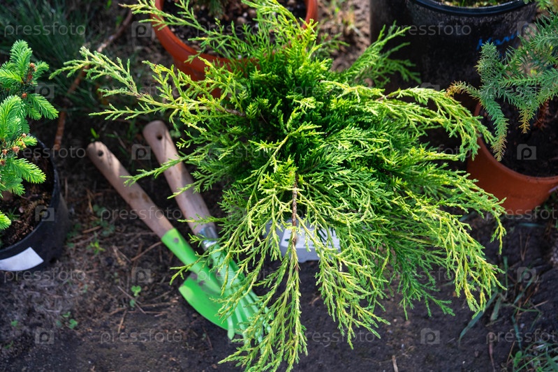 Хвойные растения в горшках с закрытым корнем для посадки на своем приусадебном участке из питомника. Озеленение садового участка весной