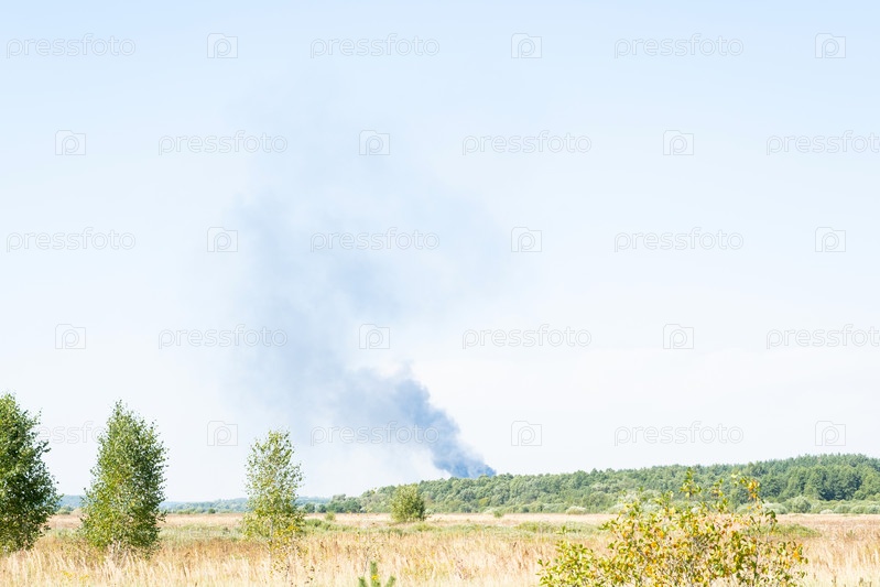 Летний лесной пожар от жары идет черным дымом. Падала весенняя трава - горит трава. Опасность деревенского пожара