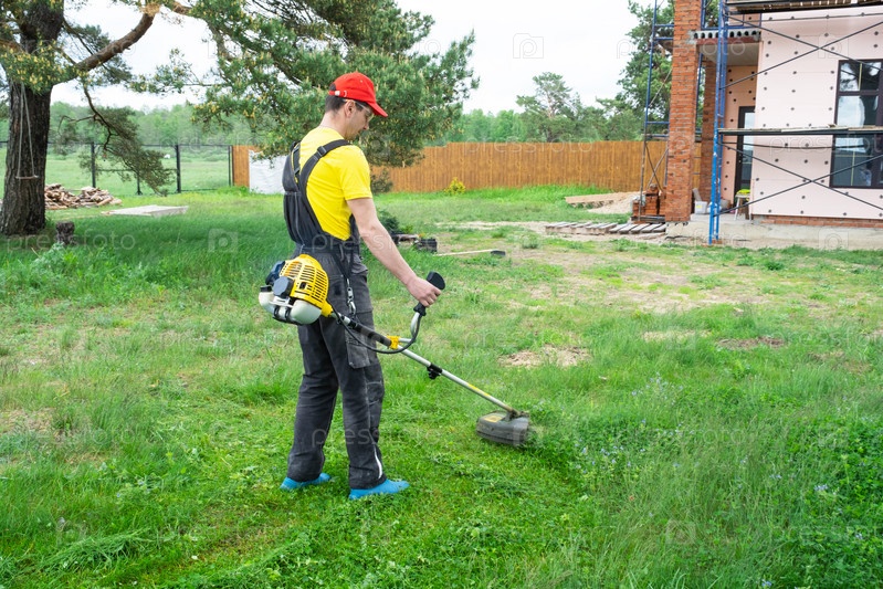 Мужчина-садовник косит зеленую траву газона на заднем дворе строительной площадки бензиновой косилкой. Триммер для ухода за садовым участком