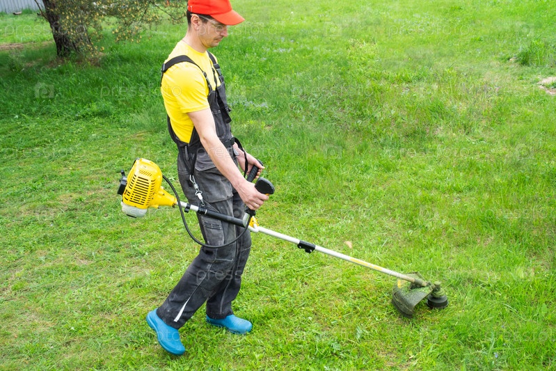 Мужчина-садовник косит зеленую траву газона на заднем дворе бензиновой косилкой. Триммер для ухода за садовым участком
