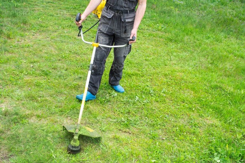 Мужчина-садовник косит зеленую траву газона на заднем дворе бензиновой косилкой. Триммер для ухода за садовым участком