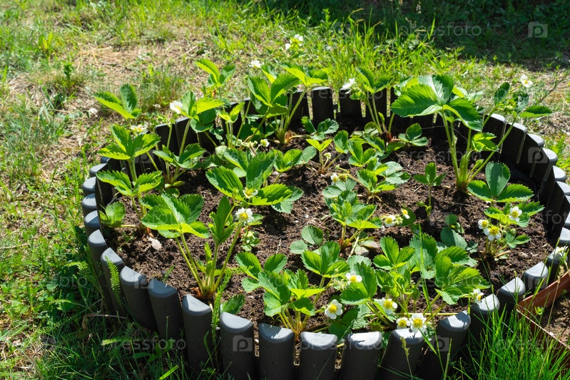 Цветение ростков клубники на круглой грядке в вашем саду. Экологически чистая ягода, выращенная фермером летом в деревне, урожай