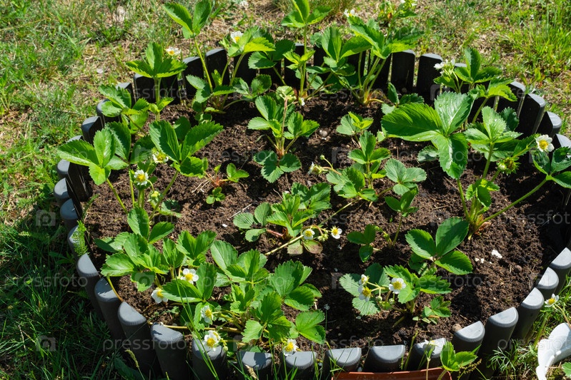 Цветение ростков клубники на круглой грядке в вашем саду. Экологически чистая ягода, выращенная фермером летом в деревне, урожай