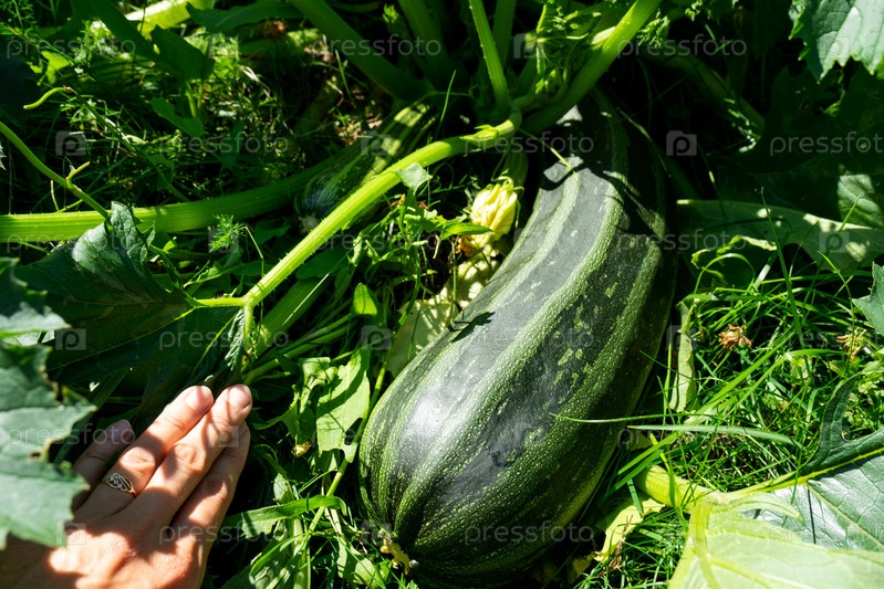 Кабачки, тыквы и кабачки на грядке на дачном участке с фермой. Экологичный урожай, экологический сад, выращивание овощей