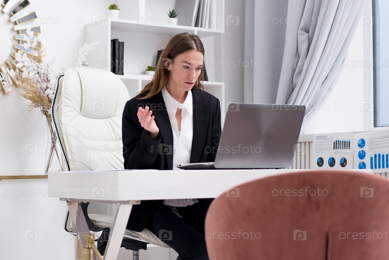 Женщина разговаривает по видеосвязи, сидя за своим столом
