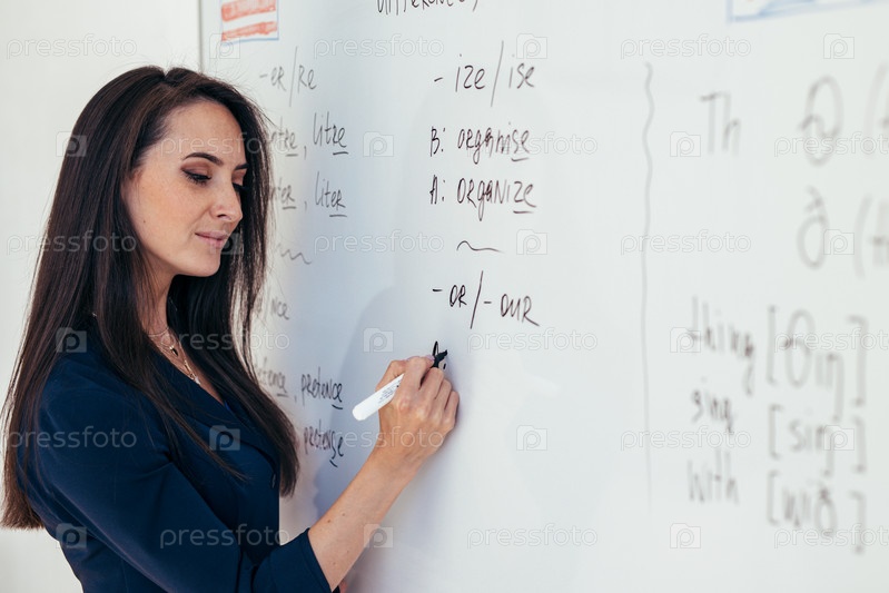 Выучить английский язык. Учитель возле доски объясняет правила