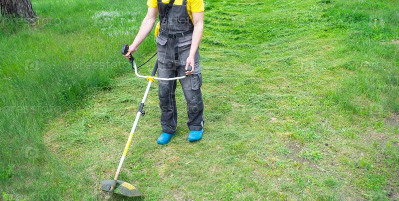 Мужчина-садовник косит зеленую траву газона на заднем дворе бензиновой косилкой. Триммер для ухода за садовым участком