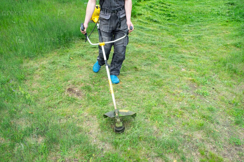 Мужчина-садовник косит зеленую траву газона на заднем дворе бензиновой косилкой. Триммер для ухода за садовым участком