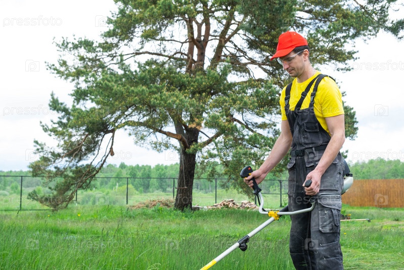 Мужчина-садовник косит зеленую траву газона на заднем дворе бензиновой косилкой. Триммер для ухода за садовым участком