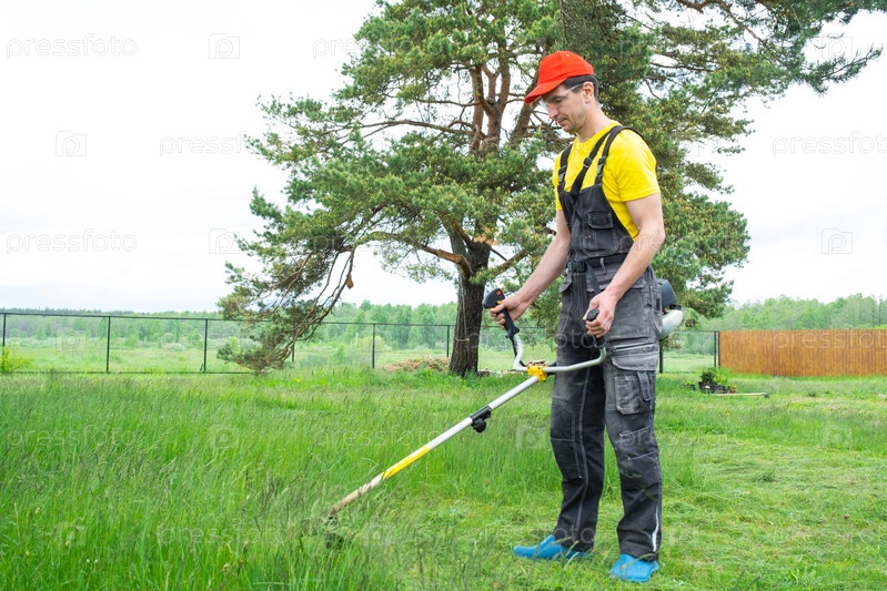 Мужчина-садовник косит зеленую траву газона на заднем дворе бензиновой косилкой. Триммер для ухода за садовым участком