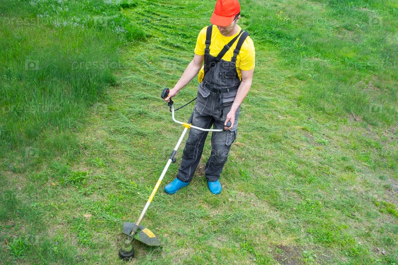 Мужчина-садовник косит зеленую траву газона на заднем дворе бензиновой косилкой. Триммер для ухода за садовым участком