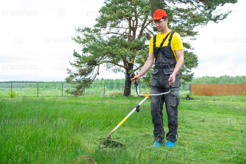 Мужчина-садовник косит зеленую траву газона на заднем дворе бензиновой косилкой. Триммер для ухода за садовым участком