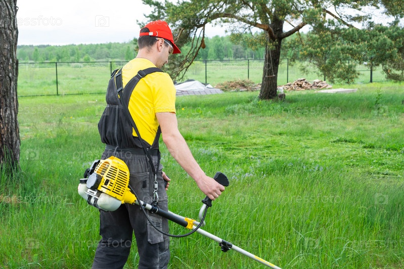 Мужчина-садовник косит зеленую траву газона на заднем дворе бензиновой косилкой. Триммер для ухода за садовым участком