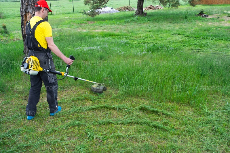 Мужчина-садовник косит зеленую траву газона на заднем дворе бензиновой косилкой. Триммер для ухода за садовым участком