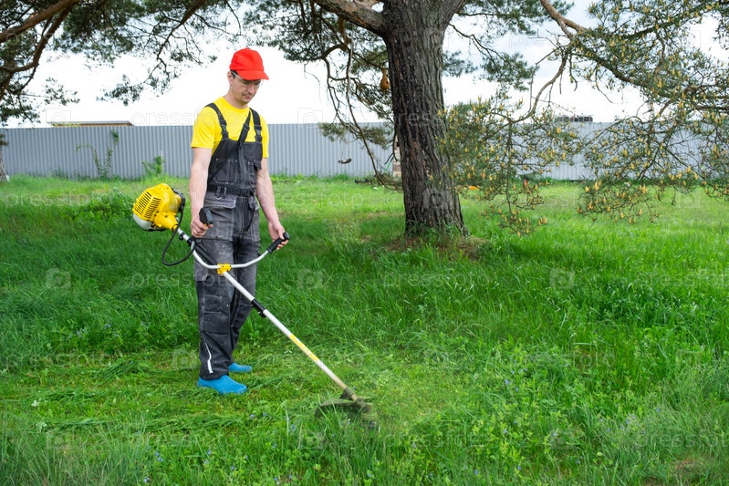 Мужчина-садовник косит зеленую траву газона на заднем дворе бензиновой косилкой. Триммер для ухода за садовым участком