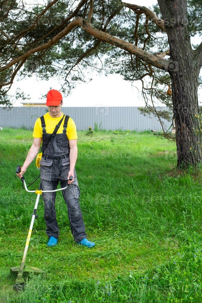 Мужчина-садовник косит зеленую траву газона на заднем дворе бензиновой косилкой. Триммер для ухода за садовым участком