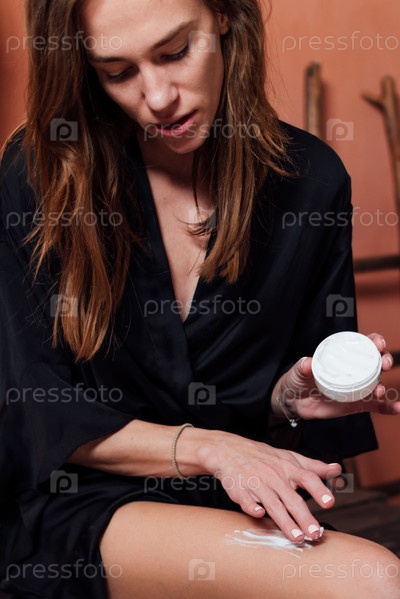 Женщина наносит крем на ногу и втирает его в кожу
