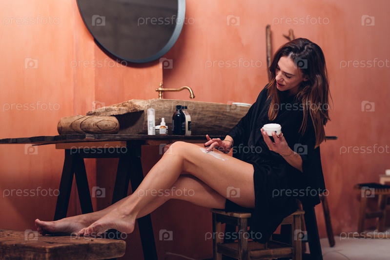 Женщина наносит крем на кожу ног