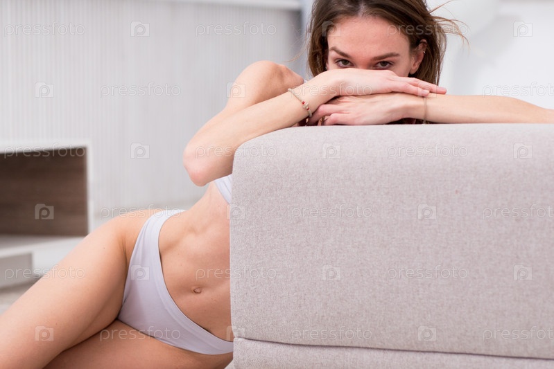Женщина в нижнем белье сидит на полу у дивана и смотрит в камеру