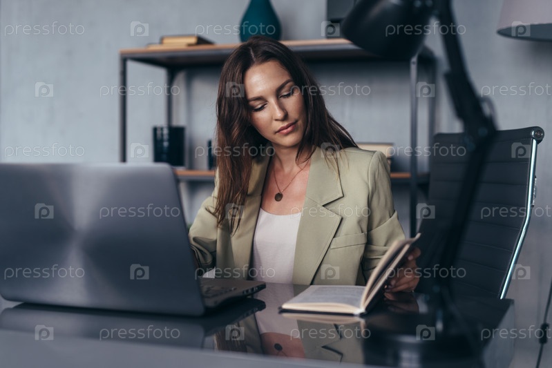 Женщина работает в офисе, сидя за своим столом со своим ноутбуком