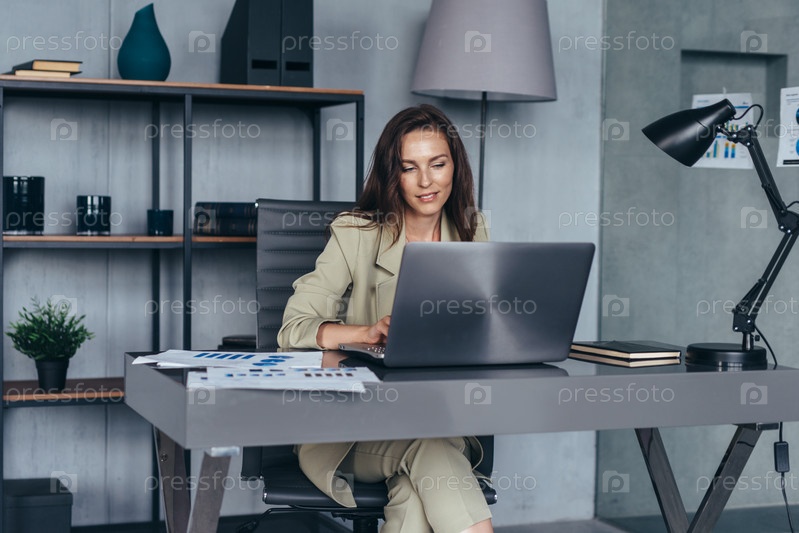 Улыбающаяся деловая женщина, работающая с ноутбуком