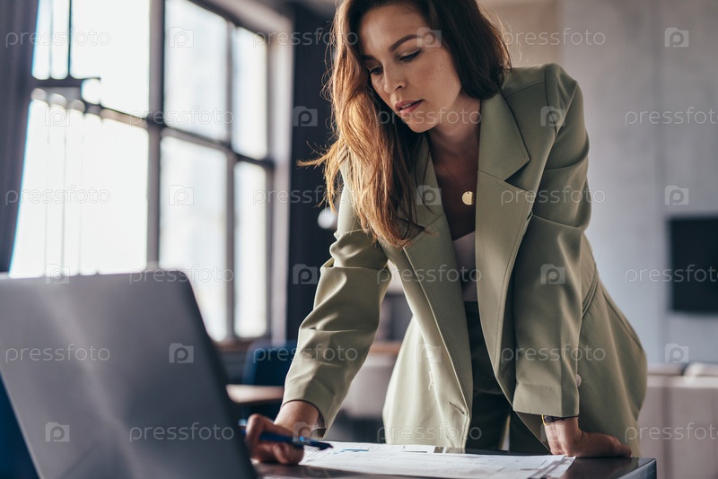 Женщина стоит, опираясь на свой стол, и использует свой ноутбук