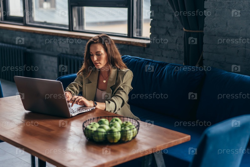 Женщина дома сидит за кухонным столом с ноутбуком