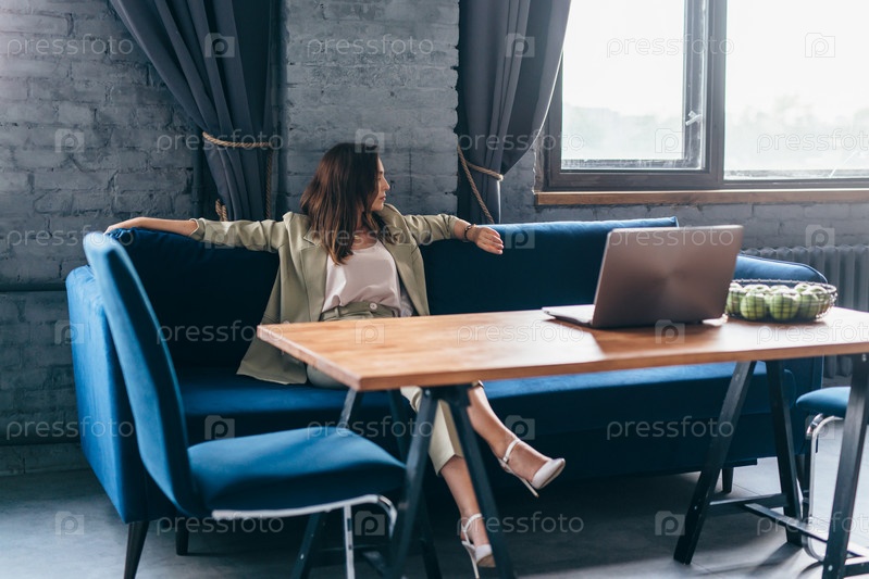 Женщина сидит на диване в гостиной и ждет, глядя на часы