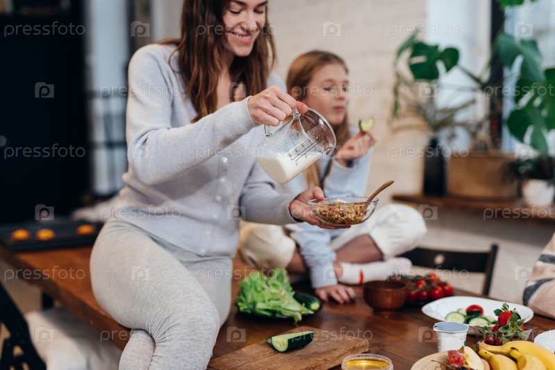 Молодая женщина готовит завтрак, наливает мюсли с молоком