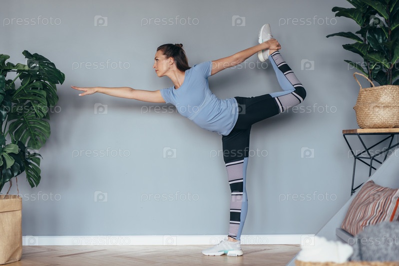 Подходящая женщина тренируется дома. Растяжка и балансировка на одной ноге