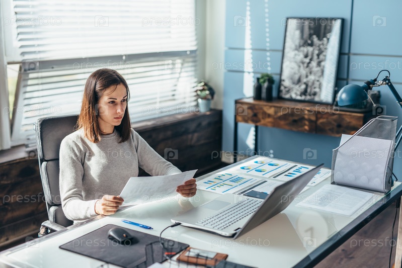 Женщина сидит за своим столом в офисе и работает