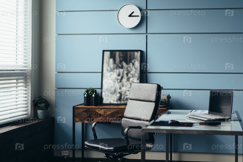 Рабочее место в офисе с ноутбуком на столе без людей
