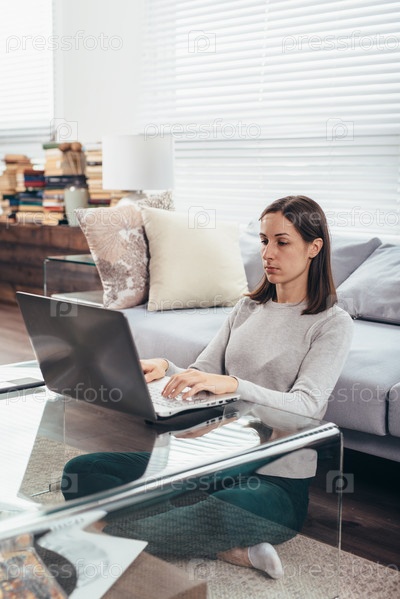 Женщина сидит на полу и опирается на диван с помощью ноутбука