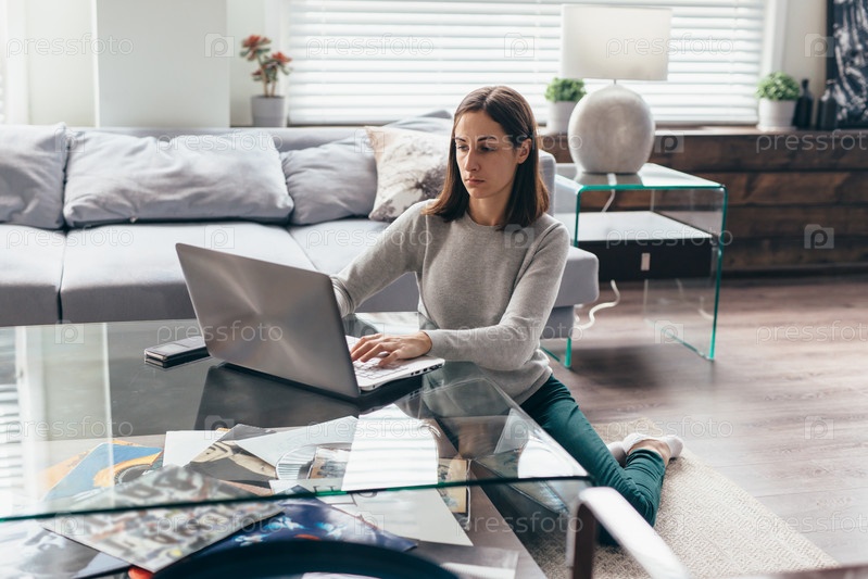 Женщина сидит дома на полу с ноутбуком на журнальном столике