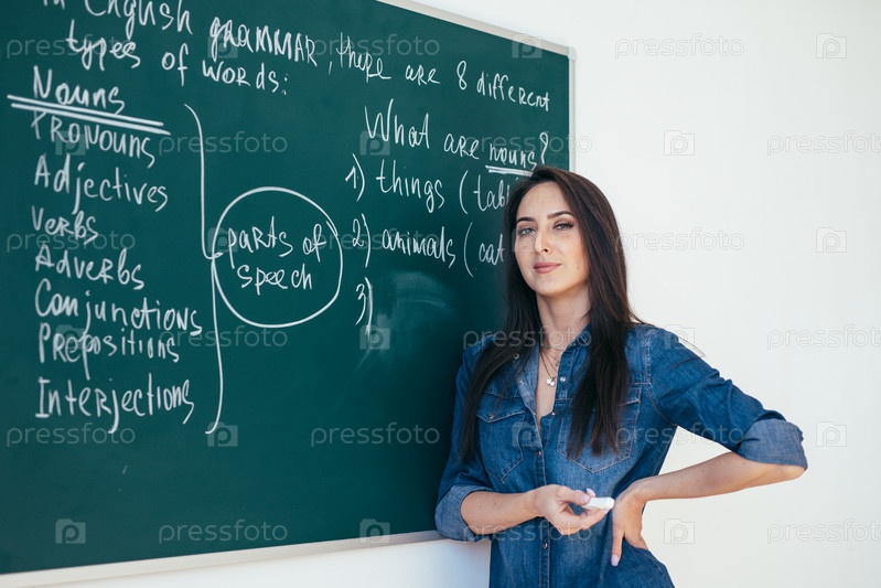 Портрет учителя английского, пишущего на доске в классе